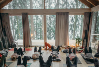 Unsere Yogashala, mitten im Wald gelegen, bietet 80 m² Holzboden und Glaswände auf allen Seiten, sodass du dich beim Praktizieren ganz von der Schönheit des Waldes umgeben fühlst.