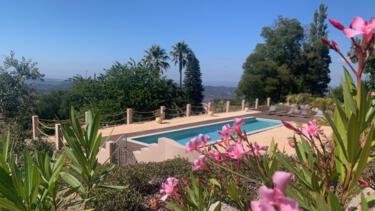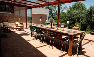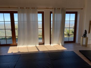 We practice every day in a beautiful yoga shala offering panoramic views through large windows that open to the beauty of the surrounding landscape. The lower part of the property is home to food forests, vegetable gardens, and untouched wild nature, while the upper area features a 15-meter pool where you can swim and soak in the sun in a deckchair.