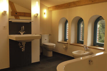 Breitenteicher Mühle consists of two beautifully restored buildings: the grand historic mill and the smaller miller’s house. The old mill offers six comfortable double rooms and three shared bathrooms, with two double rooms sharing each bathroom. In the miller’s house, you’ll find additional double rooms, including a large double room with a private bathroom, as well as a spacious shared room with four beds and its own bathroom.